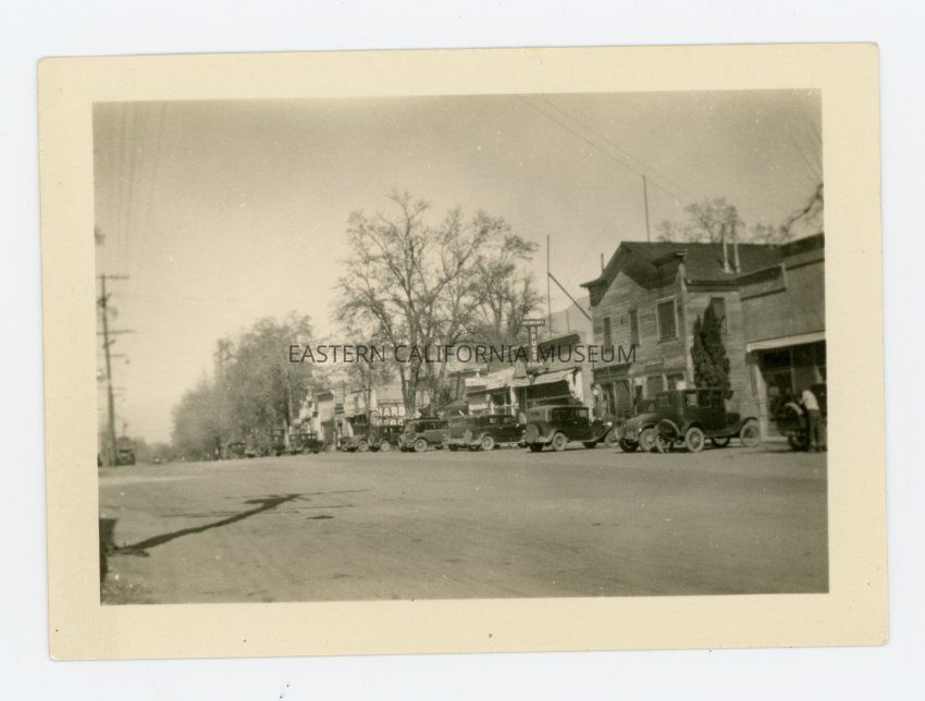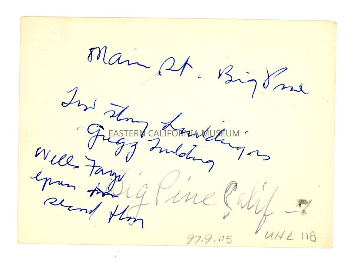 Written in blue ink on reverse: Main St. Big Pine. Two story building is Gregg building. Wells Fargo [illegible] second floor.Collection