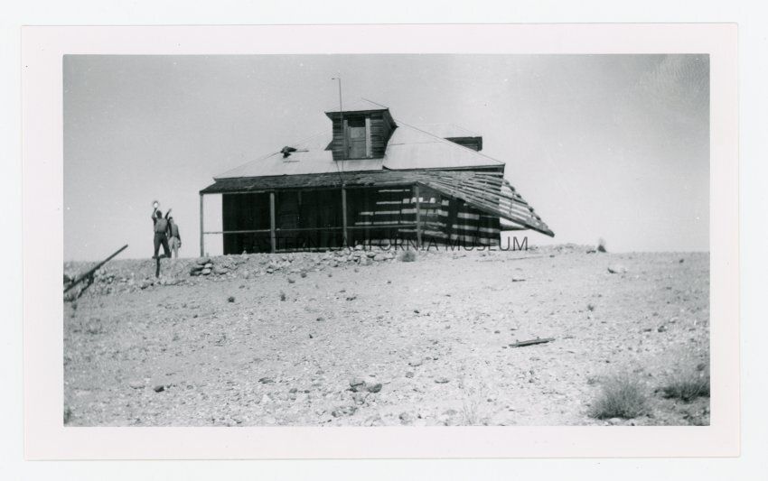 Photo identified on reverse as Skidoo in 1956. It shows a single building whose roof/porch covering is falling down. There are two men on the left.Collection