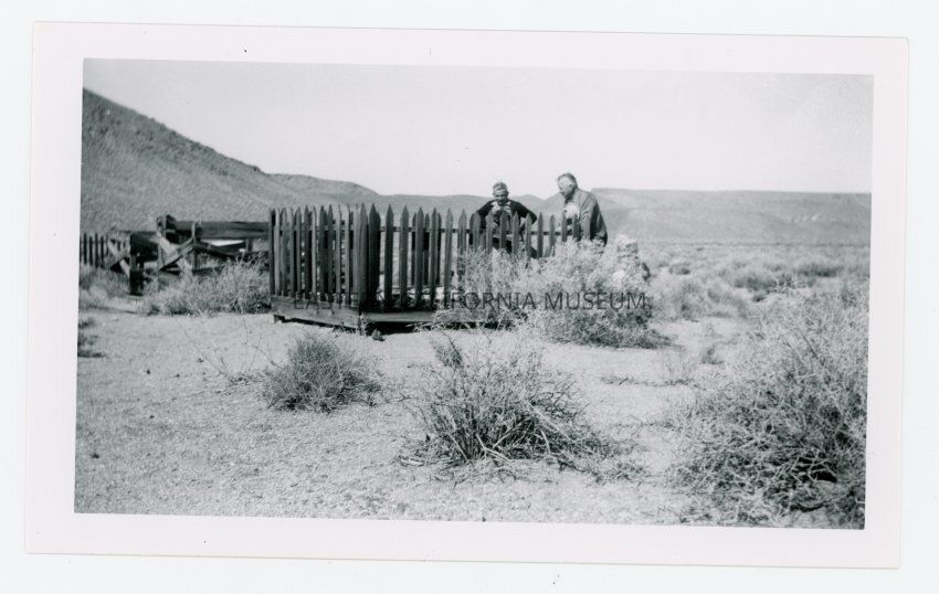 Photo identified on reverse as Skidoo in 1956. It shows two people standing next to a picket fence surrounding a grave in a cemetery.