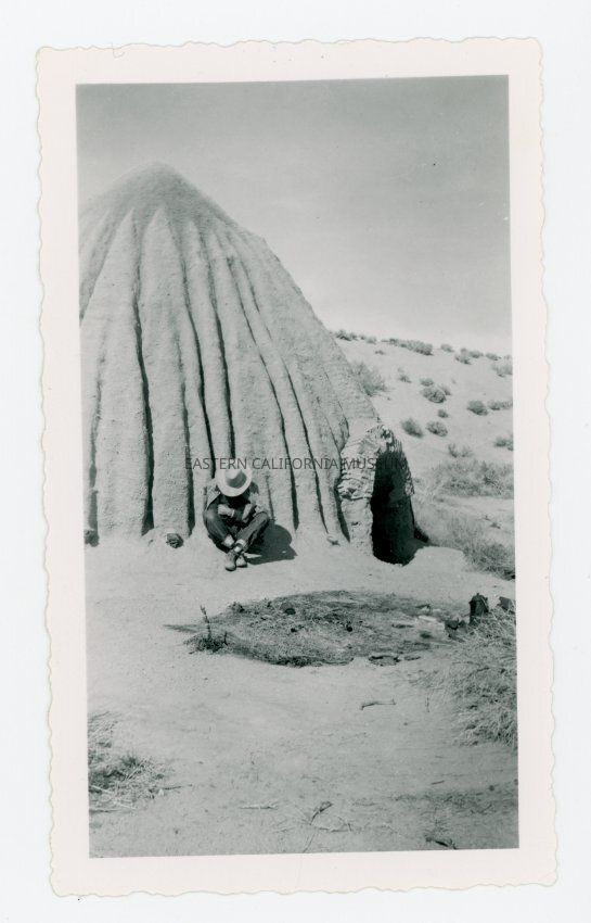 Photo of a man sitting with his back against one of the charcoal kilns near Owens Lake. The edges of the print are decoratively scalloped.