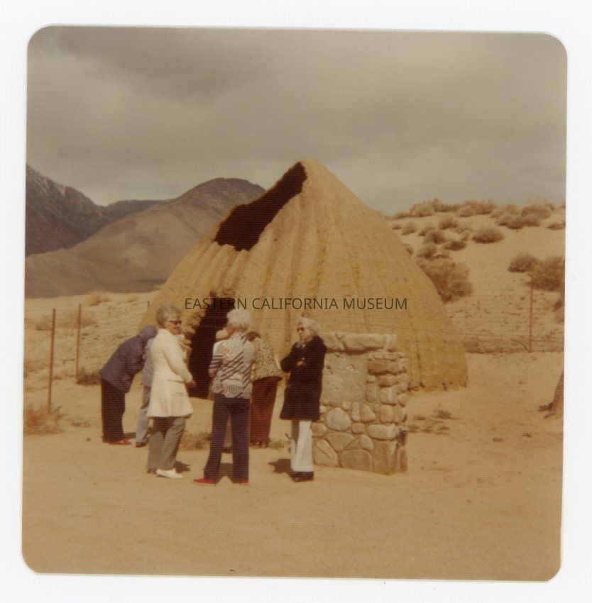 Color photo of a group of people by the Cottonwood Charcoal Kilns. A stone monument had been built, but the plaque does not appear to have been installed yet (or this was taken after the plaque was stolen).
