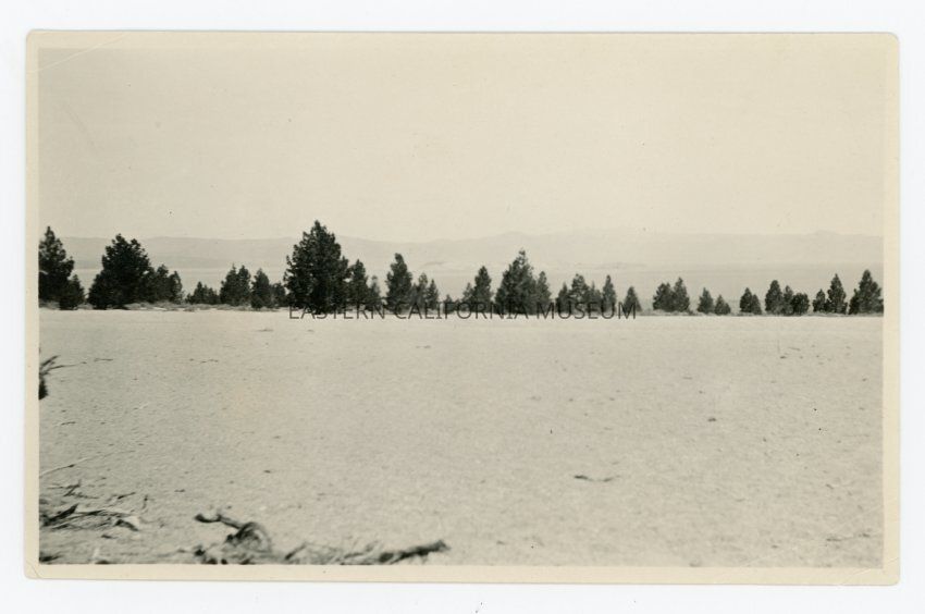 Photo of a landscape with sand, line of trees, and Mono Lake barely visible in the distance. Written on reverse: Sand Mono Lake 1921.