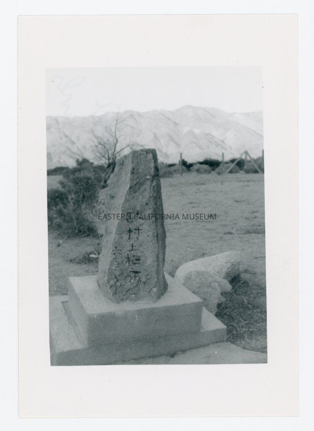Photo of a stone engraved with Japanese writing on a concrete base. Written on reverse: Gravestone Manzanar.