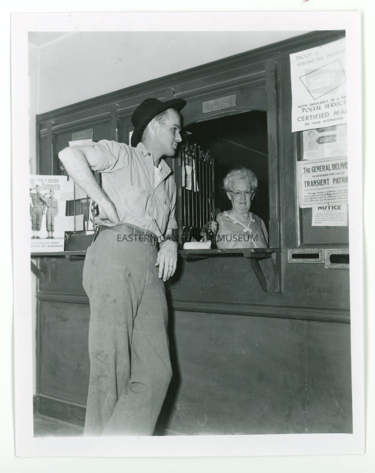 Photo of a young man leaning against the counter of the Keeler Post Office while Postmaster Lillian Hilderman stands behind the window. There are man posters on the walls, including one for certified mail, general delivery, and the Boy Scouts of America.