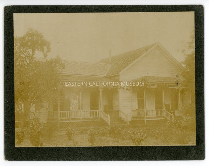 Mounted faded photo of a house. There is a woman with a dog on the front porch.