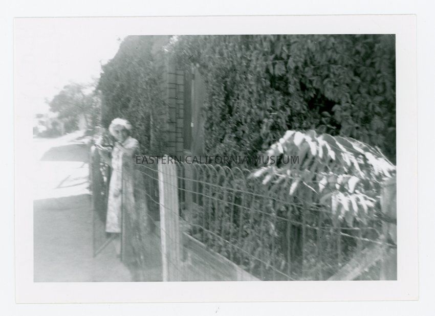 Written in blue ink on reverse: Lottie May in front of her home in Tonopah, Sept. 1961.Collection