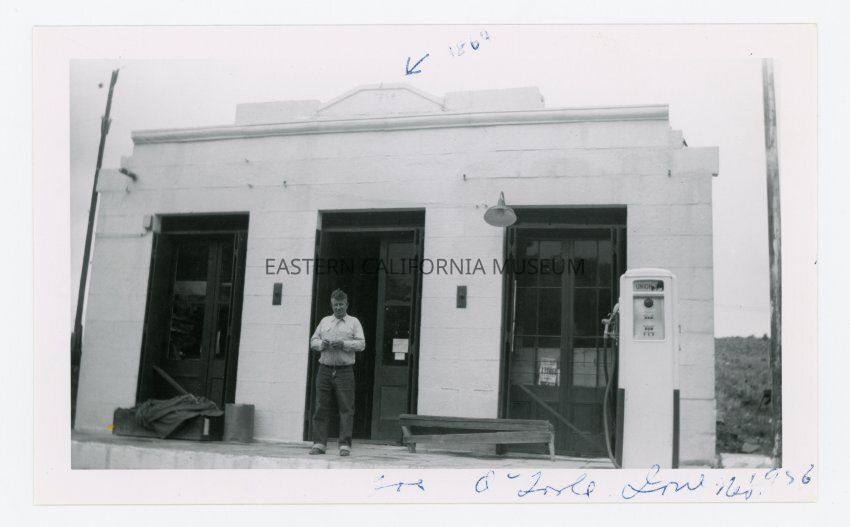 Photo of a man standing in fron tof a building that was constructed in 1864. There is a gas pump in front. He is identified as Joe O'Toole in Ione, Nev. in 1956.