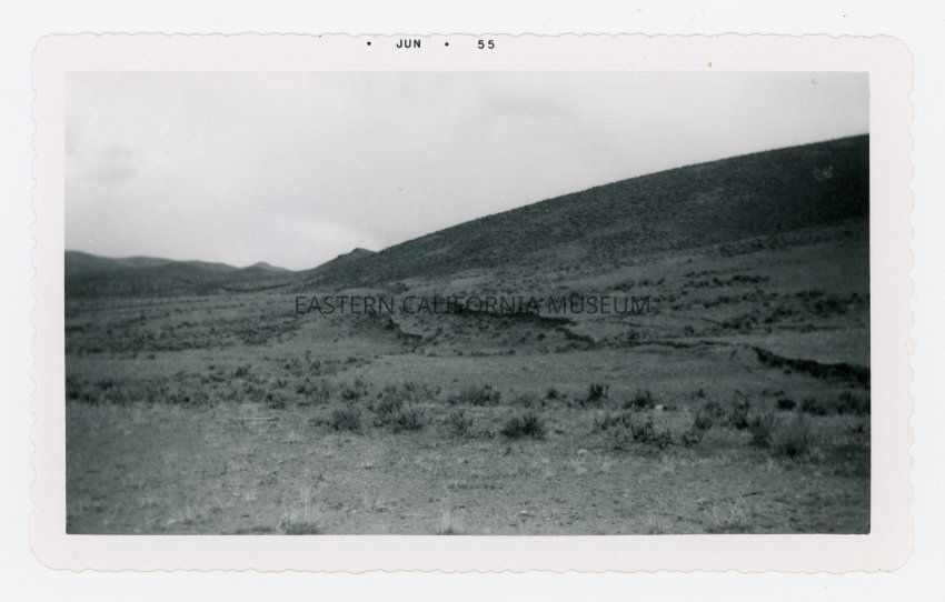 Photo identified on reverse as being taken near Gabbs, Nevada in 1954. It is of a desert landscape. Photo was printed in June of 1955.