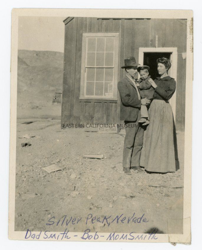 Photo of a family in front of a wooden building. They are identified on the front and back as Alvin O. Smith (dad), Gertrude E. Smith (mom), and Robert "Bob" O. Smith (son). Photo was taken at Silver Peak, Nevada, in front of their store in 1906.