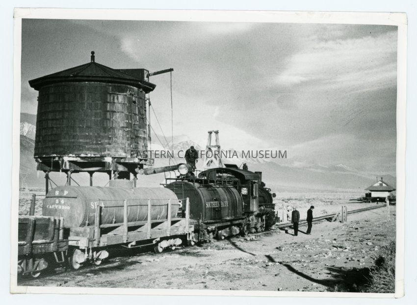 Photo of Southern Pacific engine #8 getting water from the tank at Kearsarge Station in 1948. Station house visible on right side, three people in photo.Collection