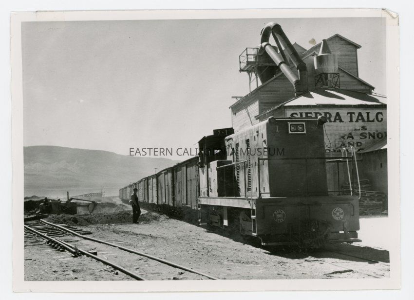 Photo of the last train from Keeler on April 29, 1960. The Sierra Talc plant is visible behind what appears to be Southern Pacific diesel engine #1 (needs verification). There is a man standing beside the boxcars and another man on a bulldozer in the background.Collection