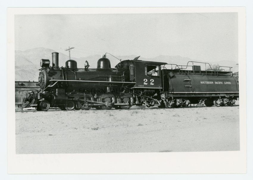 Photo of Southern Pacific engine #22 at Keeler in 1940. The train engineer is sitting in the cab.