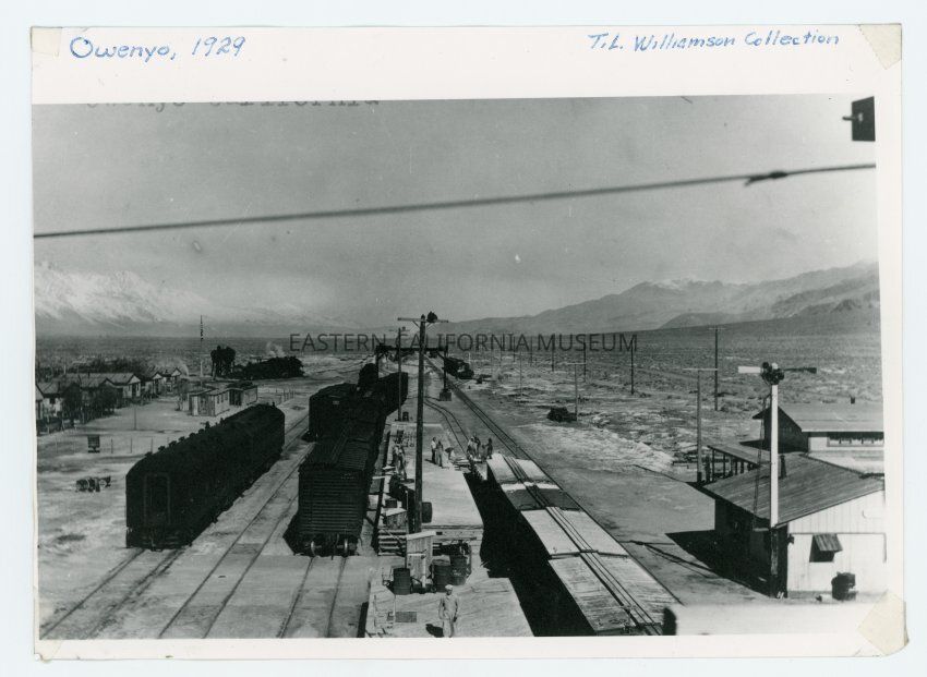 Copy of a photo of the train yard at Owenyo in 1929. It is an enlargement of A1131.4 and has cropped out the typewritten identification on front top of photo.