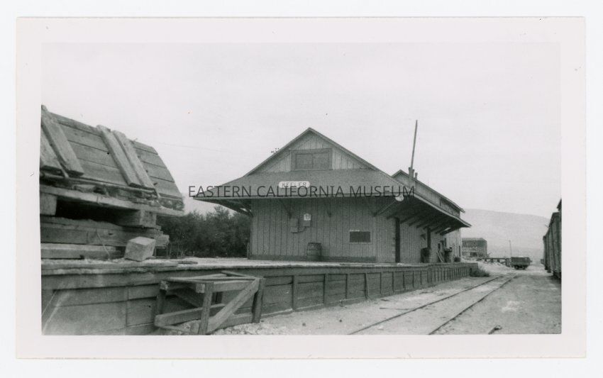 Photo the Keeler railroad station depot. Written in blue ink on reverse: Keeler. Courtesy of R. [illegible--starts with A]. Stamped on reverse: Collection of Arthur D. Haig.