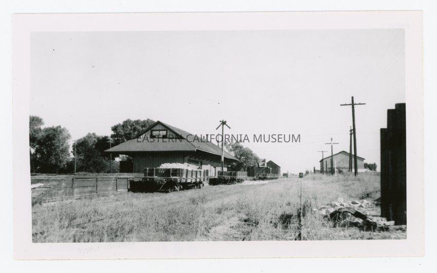 Photo a railroad station depot, some Southern Pacific cars, and a few structures in the distance. The tracks are overgrown with weeds.