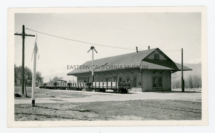 Photo of the Laws railroad station depot. There are five cars on tracks in front of the building.