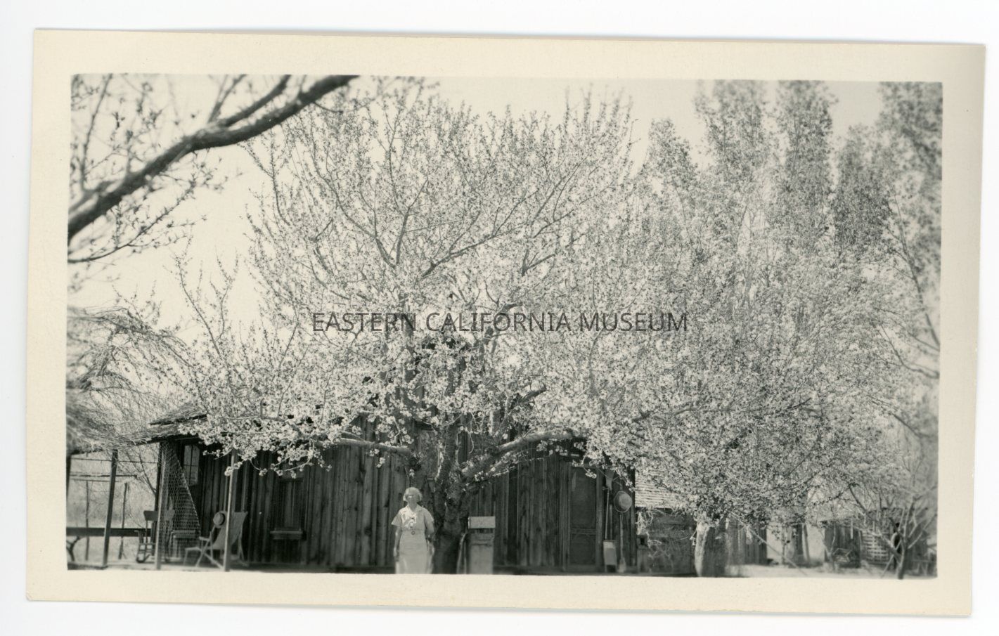 Photo of an elderly woman standing beneath flowering trees in front of what appears to be a cabin.Collection