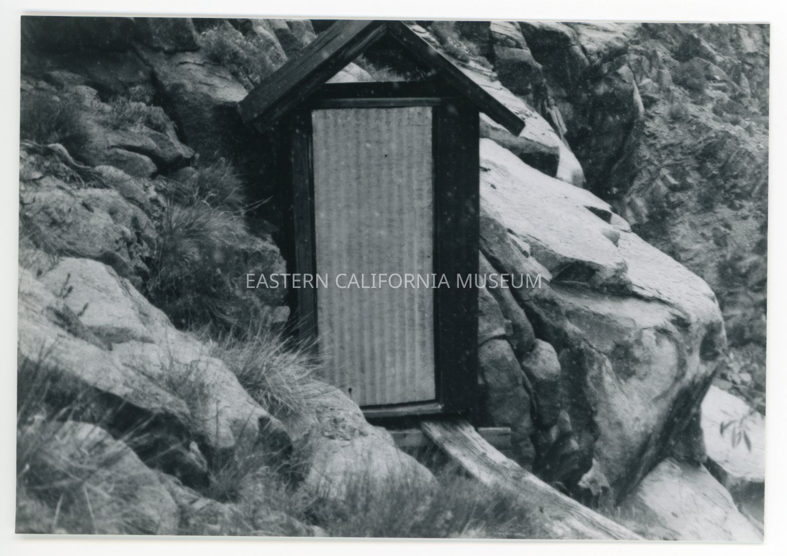 1982.24.2--Outhouse on cliff above Beveridge mining camp.