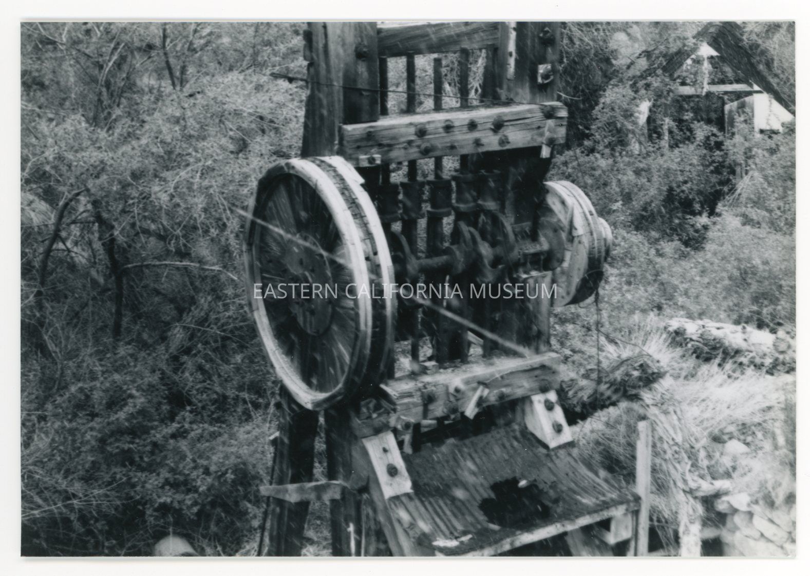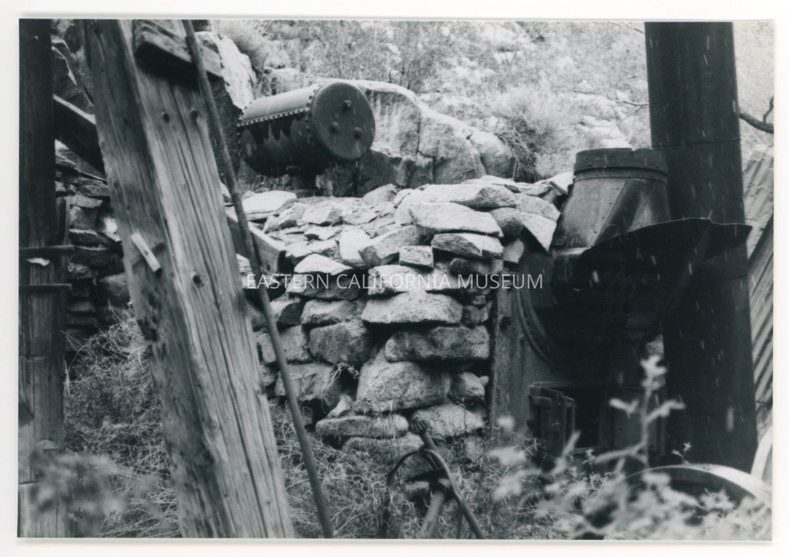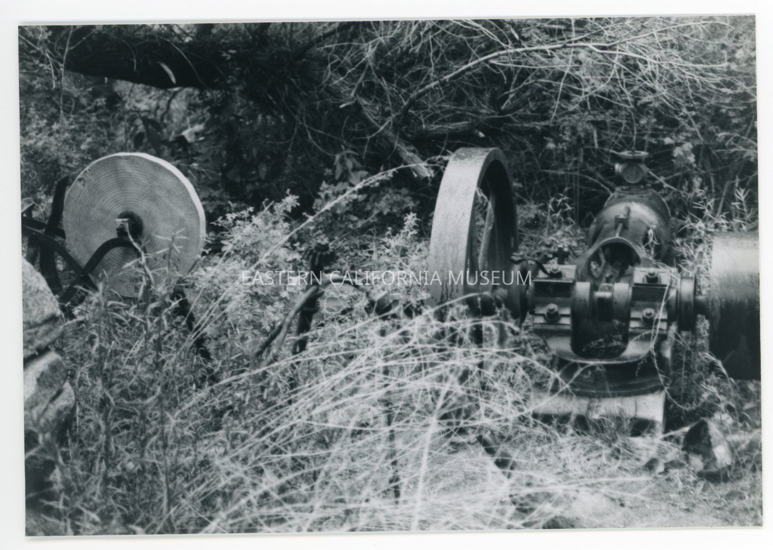 1982.24.3--Sandstone wheel and poppin jenney at Beveridge mining camp.