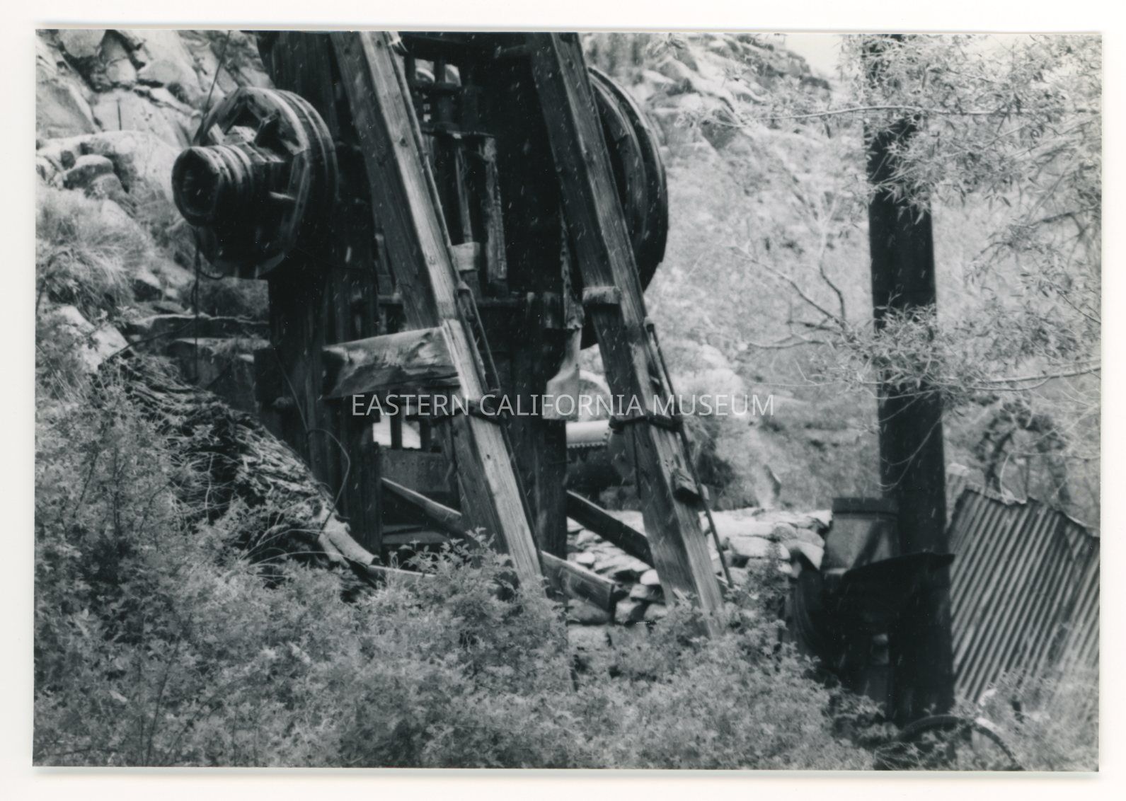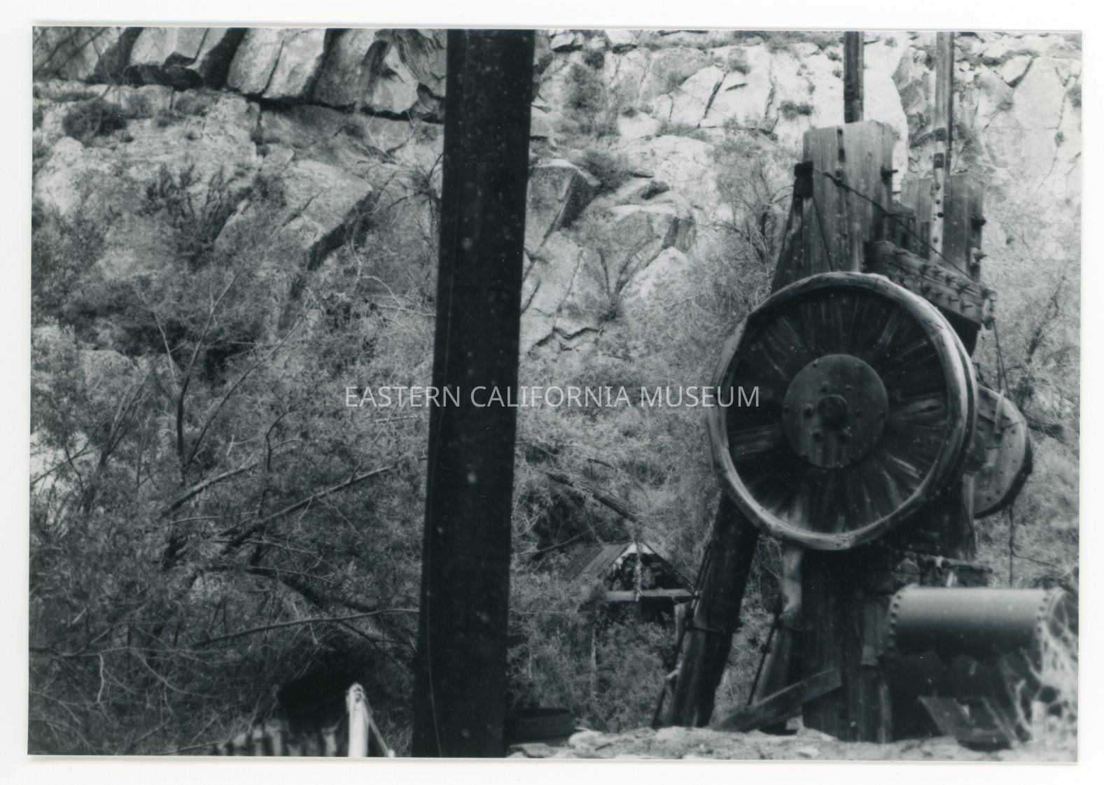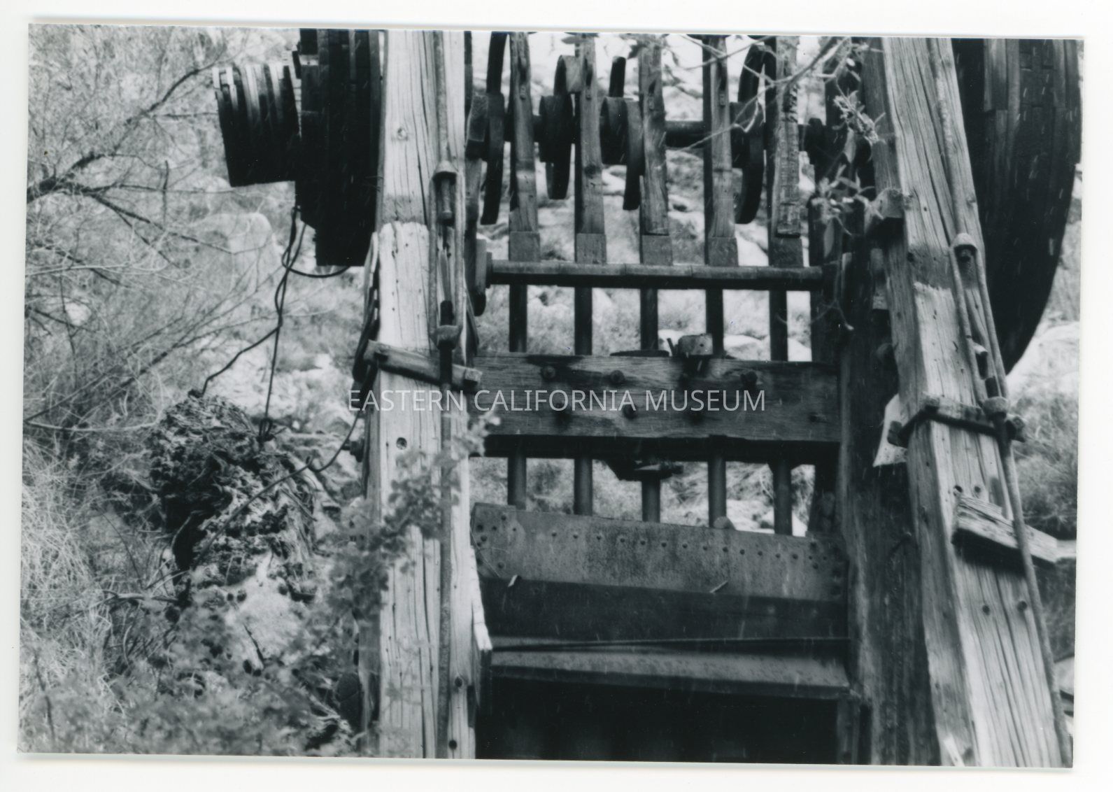 1982.24.3--Sandstone wheel and poppin jenney at Beveridge mining camp.