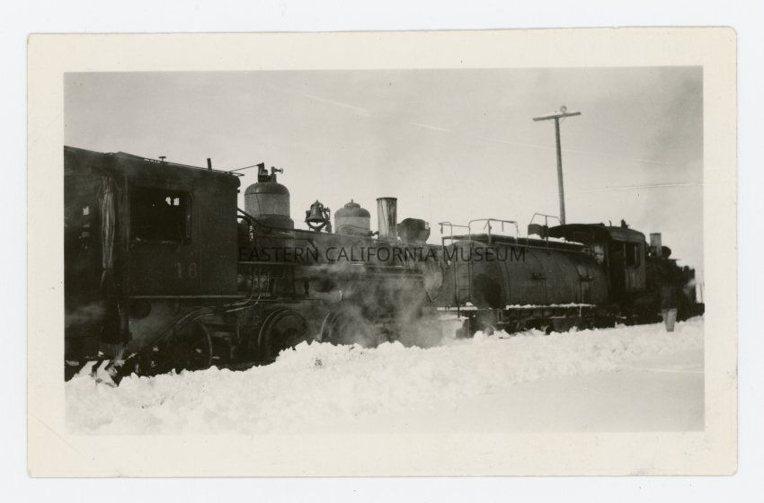Photo of two engines (Southern Pacific #16 and #18 maybe?) with piles of snow beside the tracks.