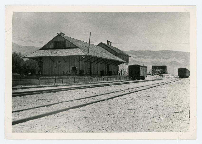 Photo of the Keeler railroad station depot with a couple boxcars on the tracks beside it.