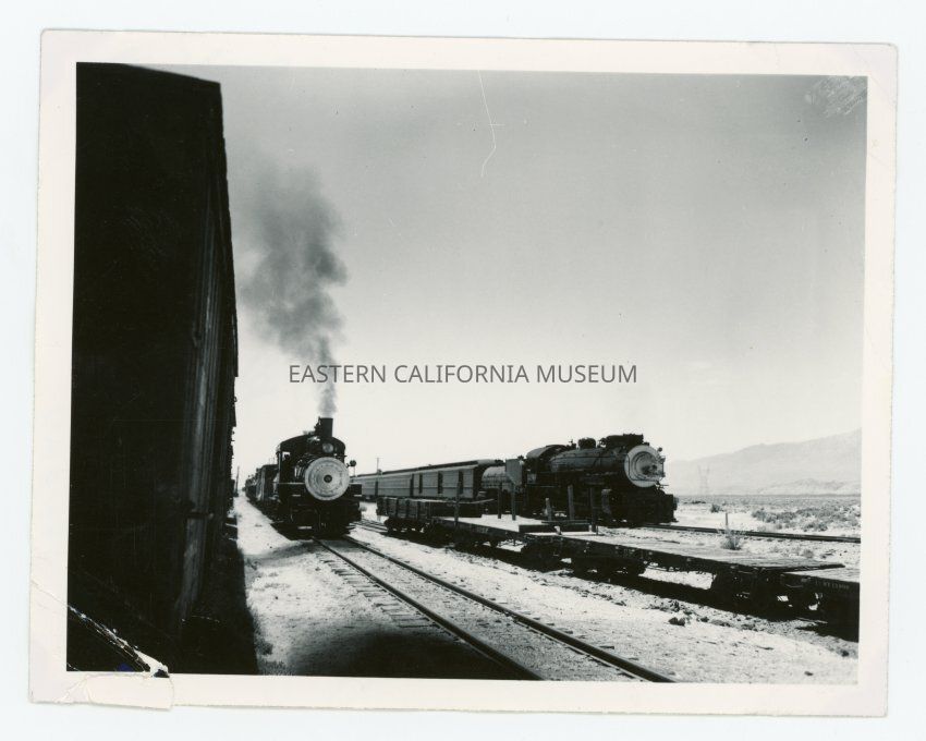Photo of two train engines (one on the left is Southern Pacific engine #18), flatbed cars, and tracks. There is black smoke coming from engine 18's smokestack. Looks like a row of boxcars on left side.