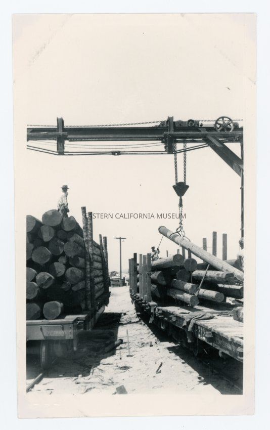 Photo of poles being transferred from what appears to be Southern Pacific flatbed car #212 to another flatbed car.