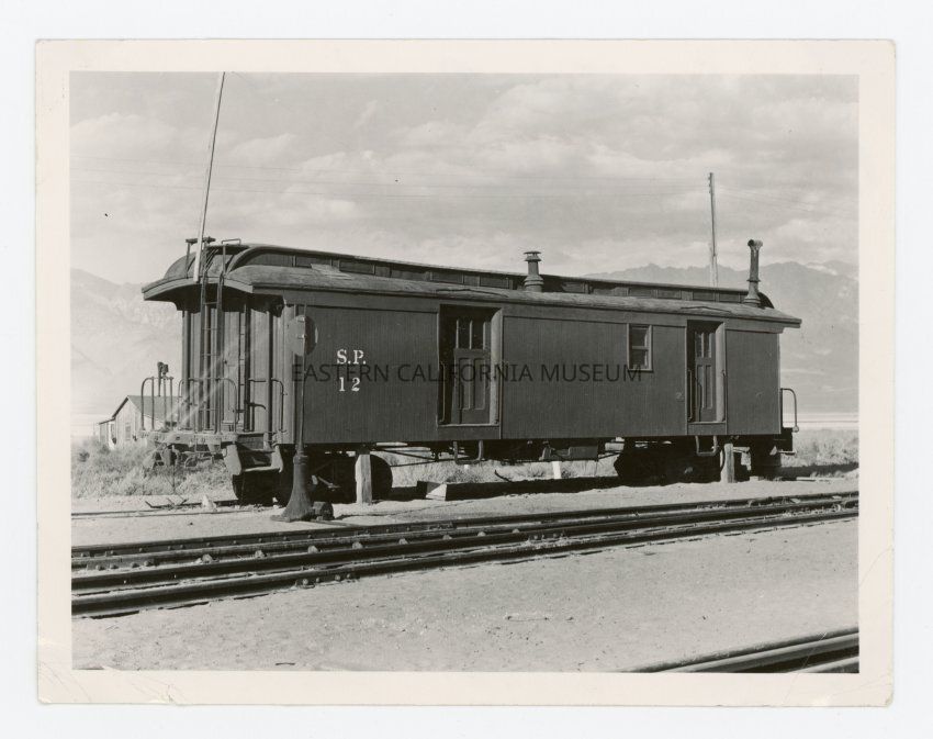 Photo of Southern Pacific caboose #12. There is a building visible behind it, and possibly the Owens Lake (dry) and Sierra Nevada mountain range?