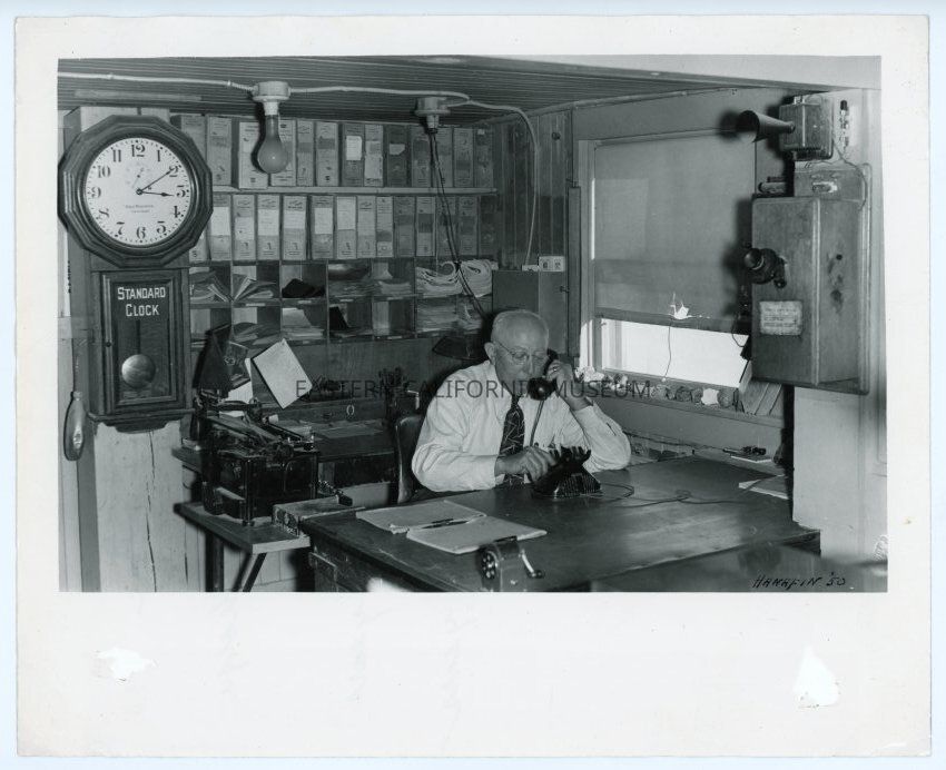 Photo of a man sitting at a desk speaking on the telephone. There is a large Standard Clock on the left side and a bunch of pigeon holes full of booklets and papers and boxes behind him. Written in lower right corner is, "Hanafin '50."