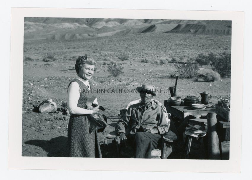 Photo of a woman (Wandalee) and Charles Ferge, better known as Seldom Seen Slim. Slim is sitting in a chair next to a table covered in dishes and cookware while Wandalee stands next to him.