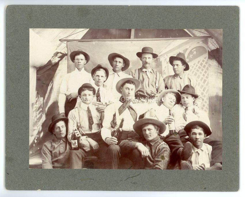 Mounted studio-esque group photo of twelve young men. They appear to be in a tent with a painted screen behind them. Three of them are holding glass bottles and all are wearing hats. The same setting was used in photo A631.3.
