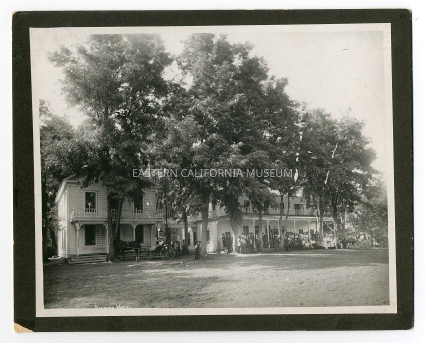 Mounted photograph of a large group of people posing in front of the Big Pine Hotel, which was at various times owned by the Callows and also by Jim Butler (then called the Butler Hotel). There are two horse-drawn buggies in the photo as well. Photographer's name not on the photo, but it is likely Mendenhall.Collection