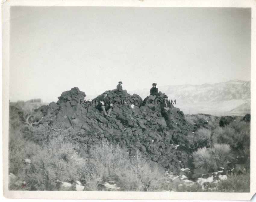 Photo of Mr. and Mrs. J. L. Ward (on right) and Mr. and Mrs. Ralph E. Robson (on left) in the Black Rock Springs area. Mr. Robson was Superintendent of the Owens Valley Improvement Company at Manzanar.Collection