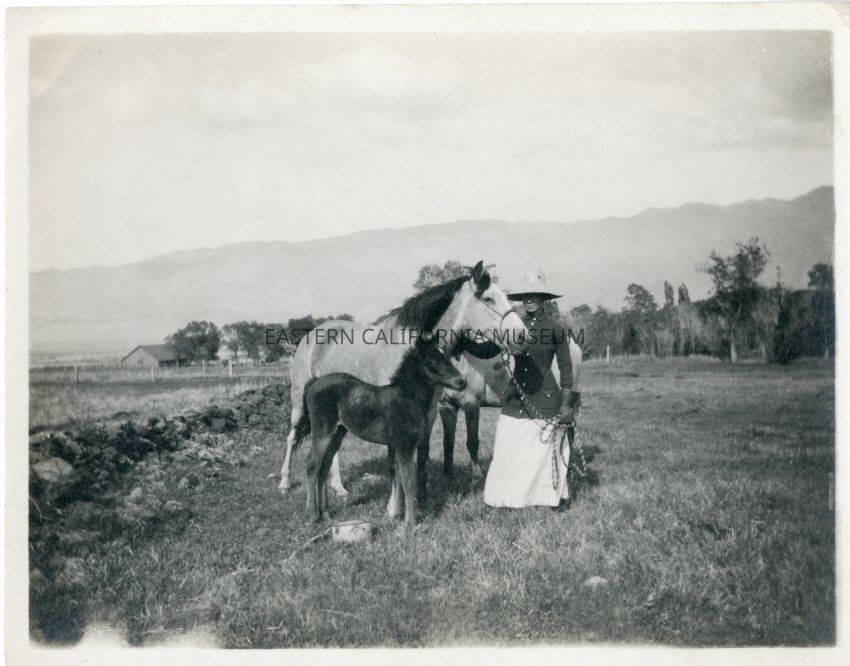 Photo of Grace Ward Robson with horses on Shepherd Ranch near Manzanar in 1913. The photo was taken looking east toward the Inyo Mountains.