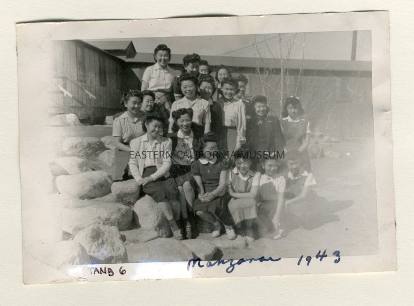 Exterior photograph of eighteen women sitting and standing in three rows on the grass and boulders in front of the Manzanar Hospital building. The label next to the photo says: "Manzanar Hospital Ward, Hospital Staff Women." On the bottom border of the photo is written "Manzanar 1943."Photograph Details