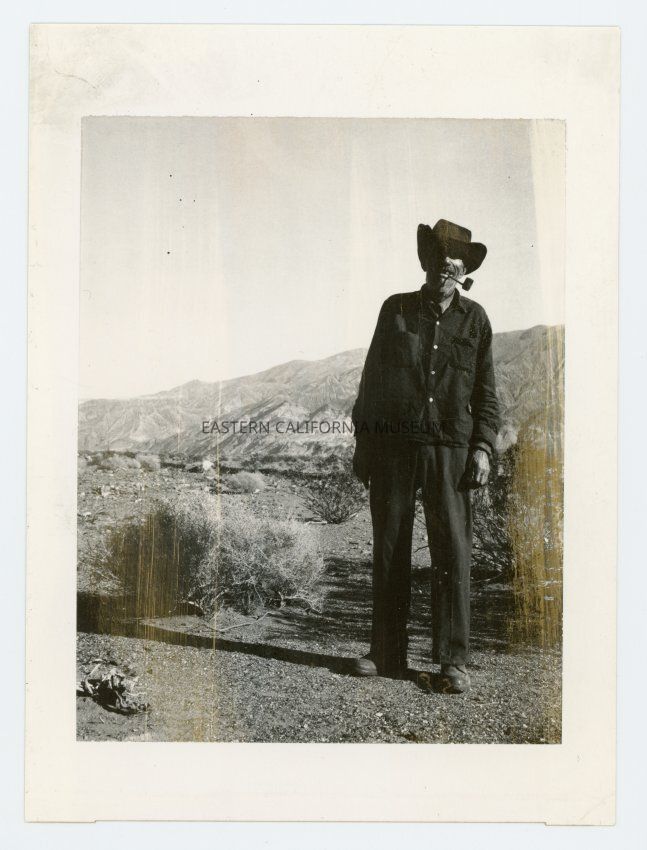 Photo of Charles Ferge, better known as Seldom Seen Slim, standing in the desert with a pipe in his mouth.