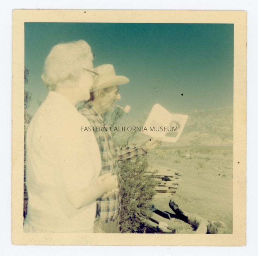 Color photo of Charles Ferge, better known as Seldom Seen Slim, holding a copy of book with his photo in it. He may be autographing it for the woman standing next to him. Photo may have been taken or developed in November 1965.