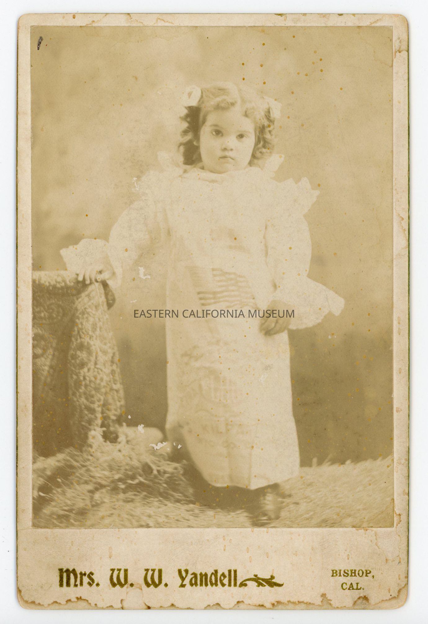 Mounted studio portrait of a young girl. Photographer was Mrs. W. W. Yandell of Bishop, CA. Photo is faded, but a U.S. flag, "flour" and "Kilpatrick" are faintly visible on her dress.