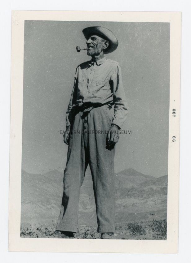 Photo of Charles Ferge, better known as Seldom Seen Slim, standing in the desert with a pipe in his mouth and a hat on his head.Collection