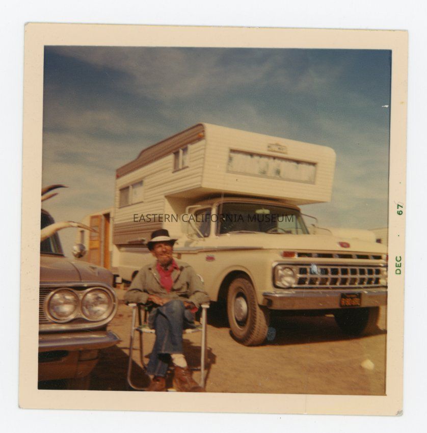 Color photo of Charles Ferge, better known as Seldom Seen Slim, sitting on a folding chair in front of a truck with a camper. Other vehicles, trailers around him.Collection