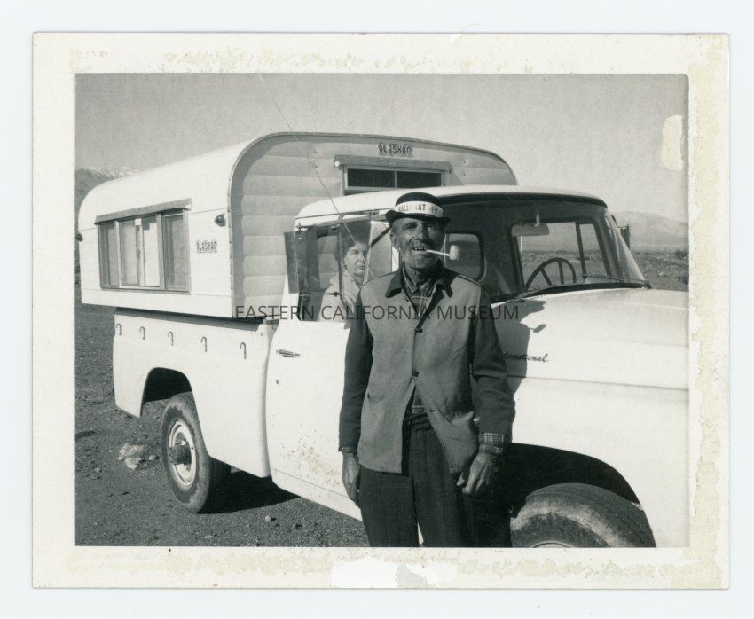 Photo of Charles Ferge, better known as Seldom Seen Slim, standing next to a pick-up truck with a camper. He is wearing a bowler-style hat with a ribbon that says "Ballarat '49ers" and he has a pipe in his mouth. There is a woman sitting in the passenger seat of the truck.Collection