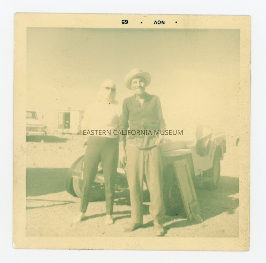 Color photo of Charles Ferge, better known as Seldom Seen Slim, with his pipe in hand standing next to a woman who is identifed as Lola Mae Studebaker. Behind them is a vehicle (jeep?) and trailer. Photo may have been taken or developed in November 1965.Collection