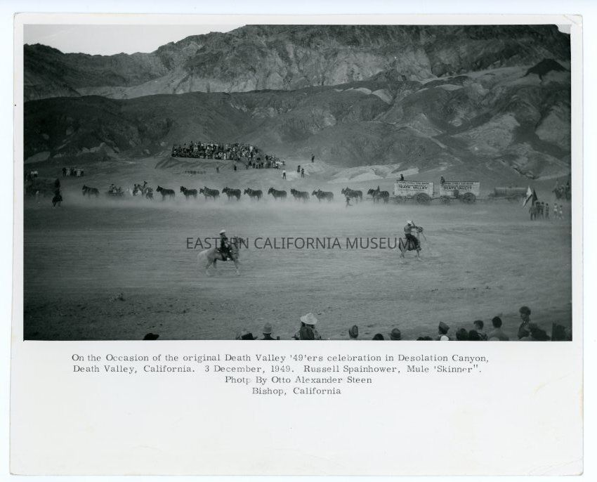 Photo of a 20-mule team hauling original Borax wagons in Desolation Canyon during the first '49ers Celebration at Death Valley on December 3, 1949. Russell Spainhower was the mule skinner or driver. Photo taken by Otto A. Steen of Bishop.Collection