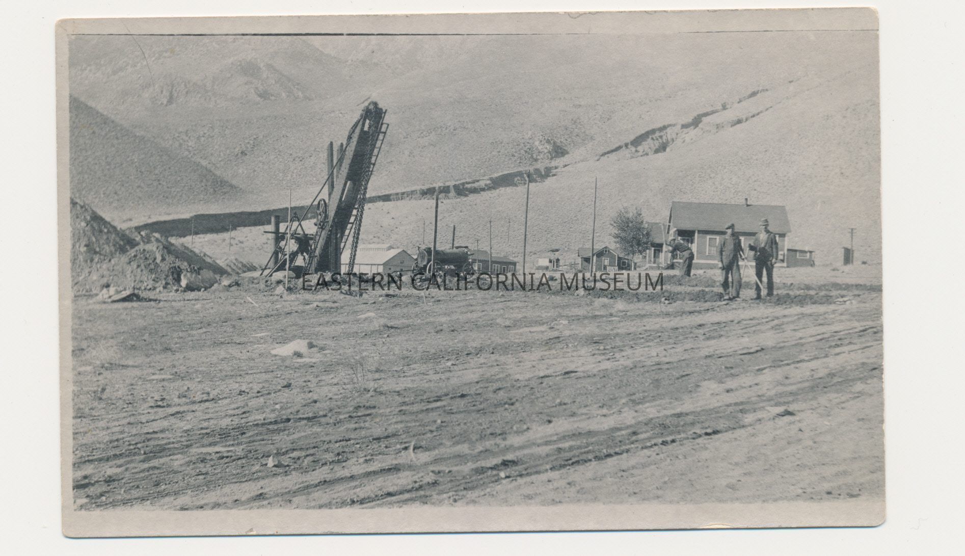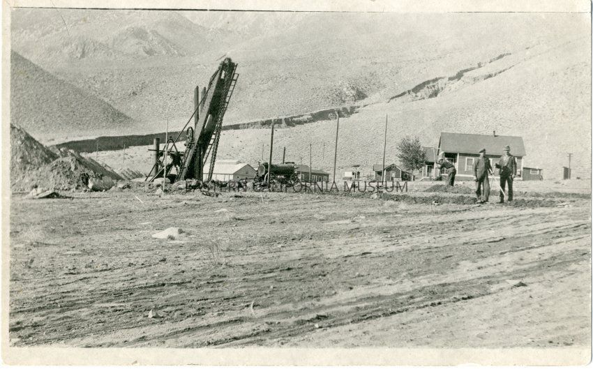 Photo postcard of the Cottonwood Power Plant with a Marion steam shovel rising from the depths of a channel and slowly chewing its way through the soft alluvium deposited by Cottonwood Creek. To the right side of the photo aqueduct laborers with hand tools may be marking out the path for the shovel to take. There are several structures (houses?) in the background.