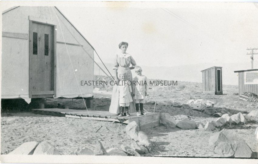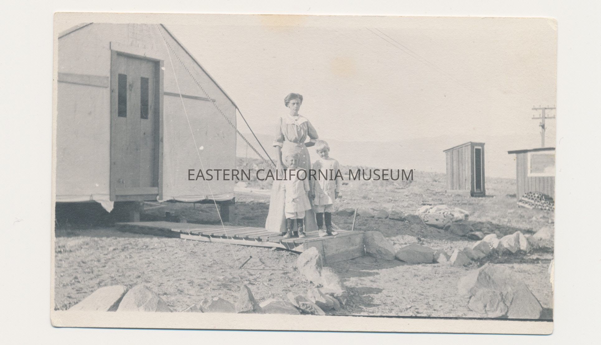 Photo postcard of an unidentified woman and two children standing on a wooden walkway next to a LADWP tent house at Cottonwood Power Plant. They could be the family of one of the power plant operators or aqueduct workers. Note the outhouse at right.