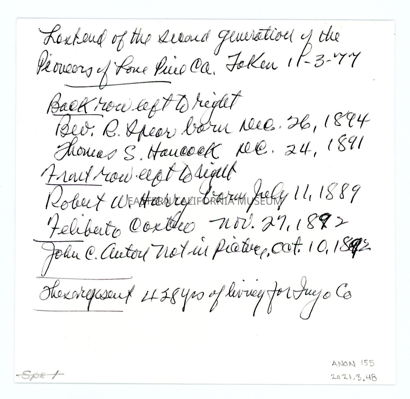 Handwritten in black ink on reverse: Last end of the second generation of the pioneers of Lone Pine, Ca. Taken 11-3-77. Back row left to right: Bev. R. Spear born Dec. 26, 1894; Thomas S. Hancock, Dec. 24. 1891. Front row left to right: Robert W. Harry born July 11, 1889; Feliberto Castro Nov. 27, 1892. Not in picture: John C. Autore Oct. 10, 1892. These represent 428 years of living for Inyo Co.Made/Created