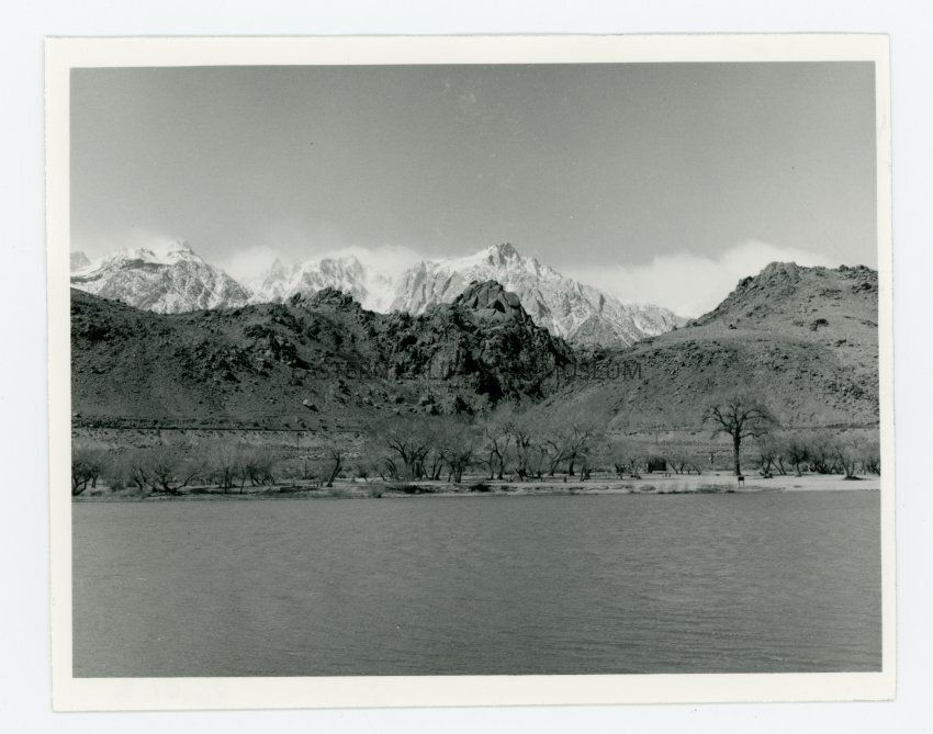 Photo of Diaz Lake, the Alabama Hills, and the snow-capped Sierra Nevada mountain range. Photo taken by Les Larson.