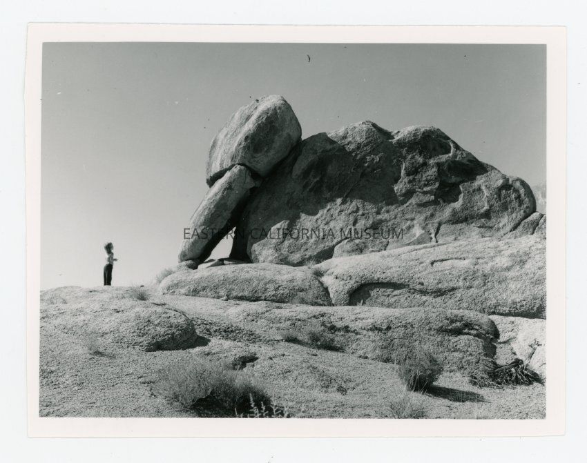 Photo a young child looking at rock formations in the Alabama Hills. Photo taken by Les Larson.Collection