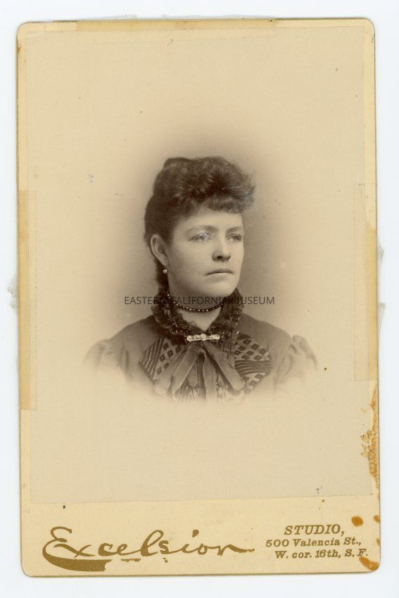 Mounted bust-length studio portrait of a woman. She is identified on the reverse as Ida Dearborn Burkhardt, born 1866 in Aurora, NV. Photographer was Excelsior Studio of San Francisco.
